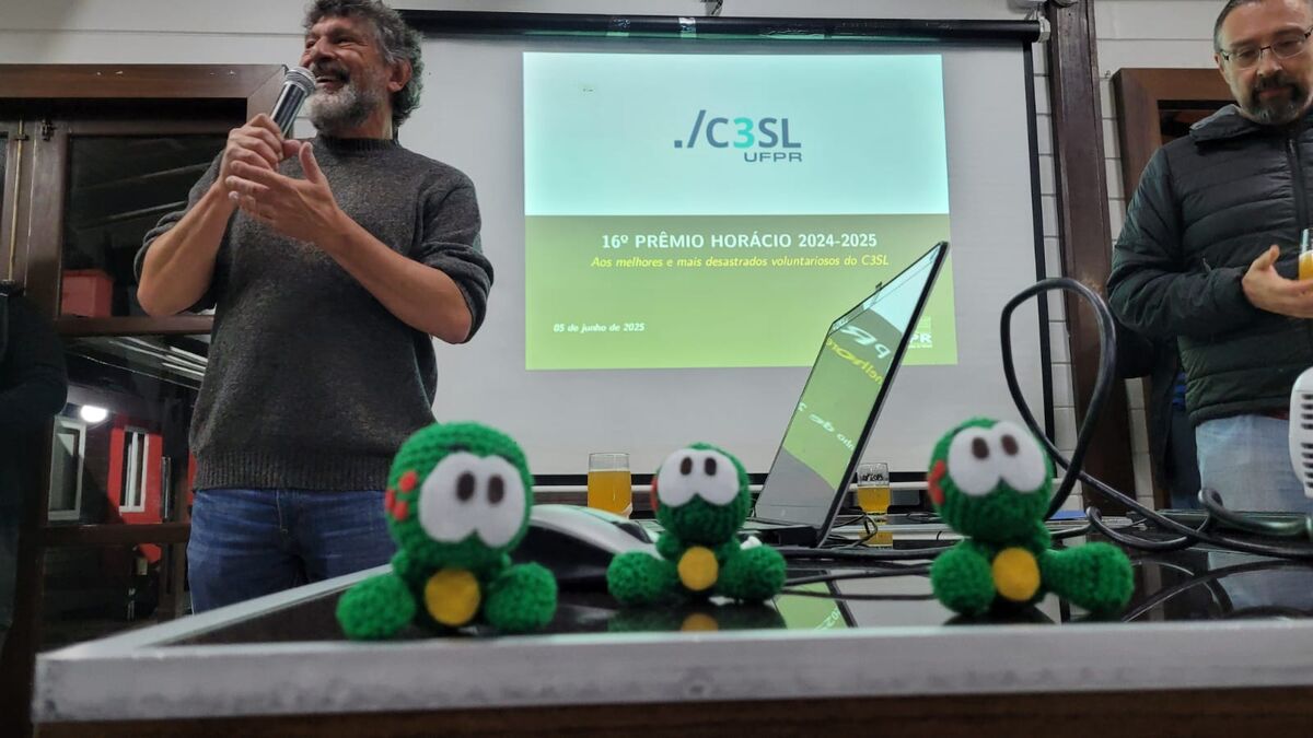 Esta foi a 16ª edição do Prêmio, que entregou aos ganhadores um Horácio feito de amigurumi pela bolsista do C3, Eloiza Cardoso, e ofereceu três categorias de premiação. “É genial estarmos aqui, pois foi uma ideia que começou com quatro pessoas que tinham uma ideia em comum mas que parecia incerta, que era a militância pelo software livre e pela ciência aberta. A gente sabe que não é fácil ser idealista no mundo de hoje, mas ver isso tudo vale muito a pena”, disse o professor e pesquisador do C3SL, Fabiano Silva.
